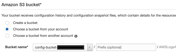 In my case I had a bucket available already. Otherwise AWS Config can get created one. The syntax will be “config-bucket-<account-id>/<prefix>/AWSLogs”