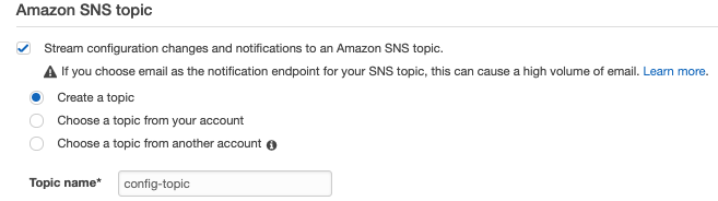 An added SNS topic will help to get other resources notified on changes. The SNS topic also can be used to get automations created to let automated remediations solve a noncompliant status or invoke something else in case a compliance state would be triggered. For the sake of convenience the SNS topic created in this example will have an email subscription.