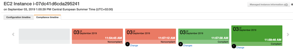Once everything is configured and first iterations for compliance tracking are executed by the AWS Config service a Timeline can be opened up to visualize the configuration status on a given resource over time.