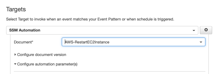 Within the Targets an automation through SSM can be selected where then the event as described above would initiate an EC2 instance restart automatically.